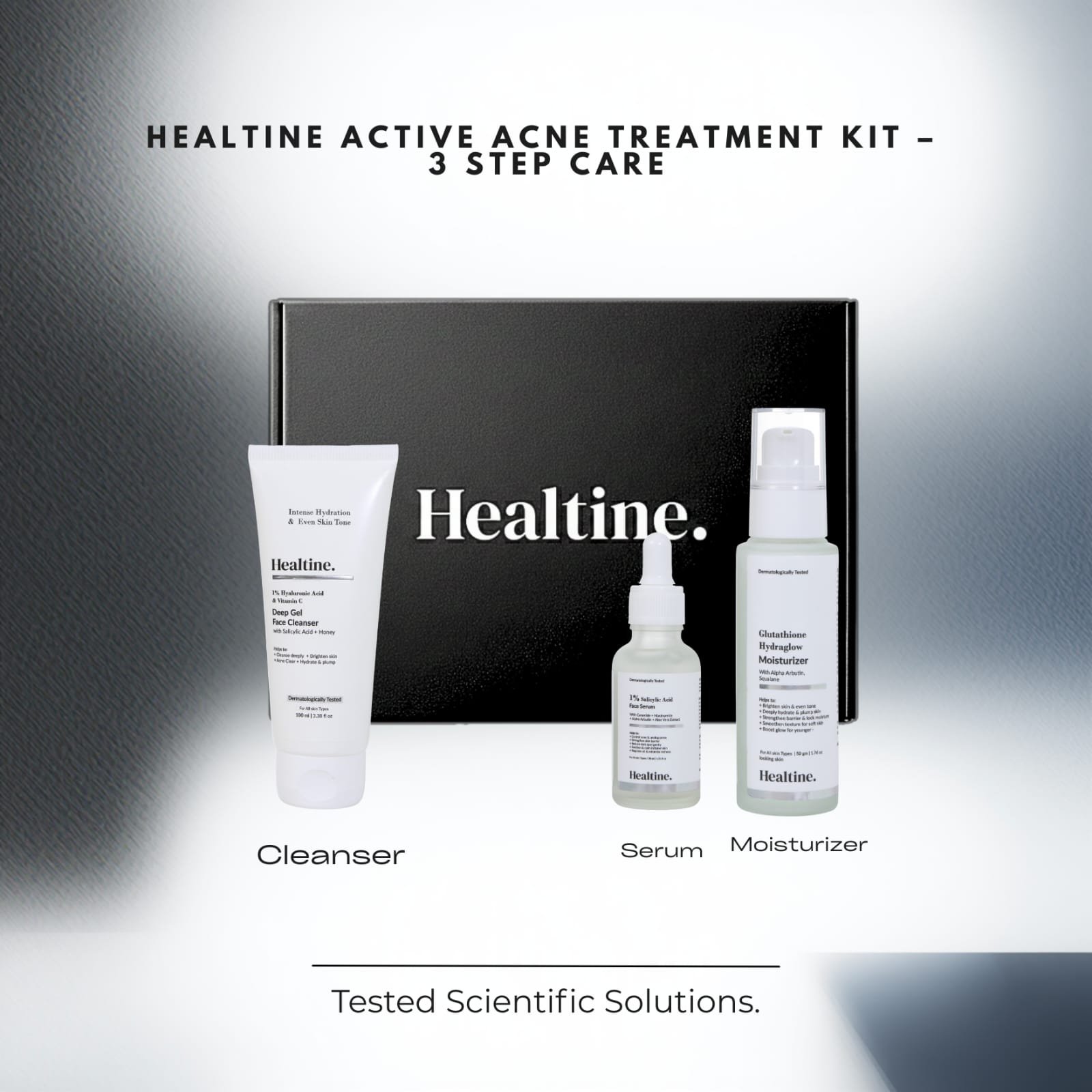 | About the Kit | The Healtine Active Acne Treatment Kit – 3 Step Care is a dermatologist-inspired 3-step routine designed for Active Acne, oily and combination skin. The kit focuses on cleansing pores, treating active acne and maintaining barrier-safe hydration to help reduce breakouts, excess oil and post-acne marks without over-drying the skin. |
