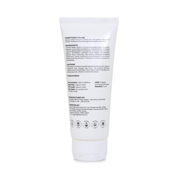 | Key Benefits | Removes dirt, excess oil & impurities Hydrates & plumps with 1% Hyaluronic Acid Brightens skin with Vitamin C Clears acne & unclogs pores with Salicylic Acid Soothes irritation with Honey Extract Improves texture, softness & smoothness Mild gel formula safe for daily use |