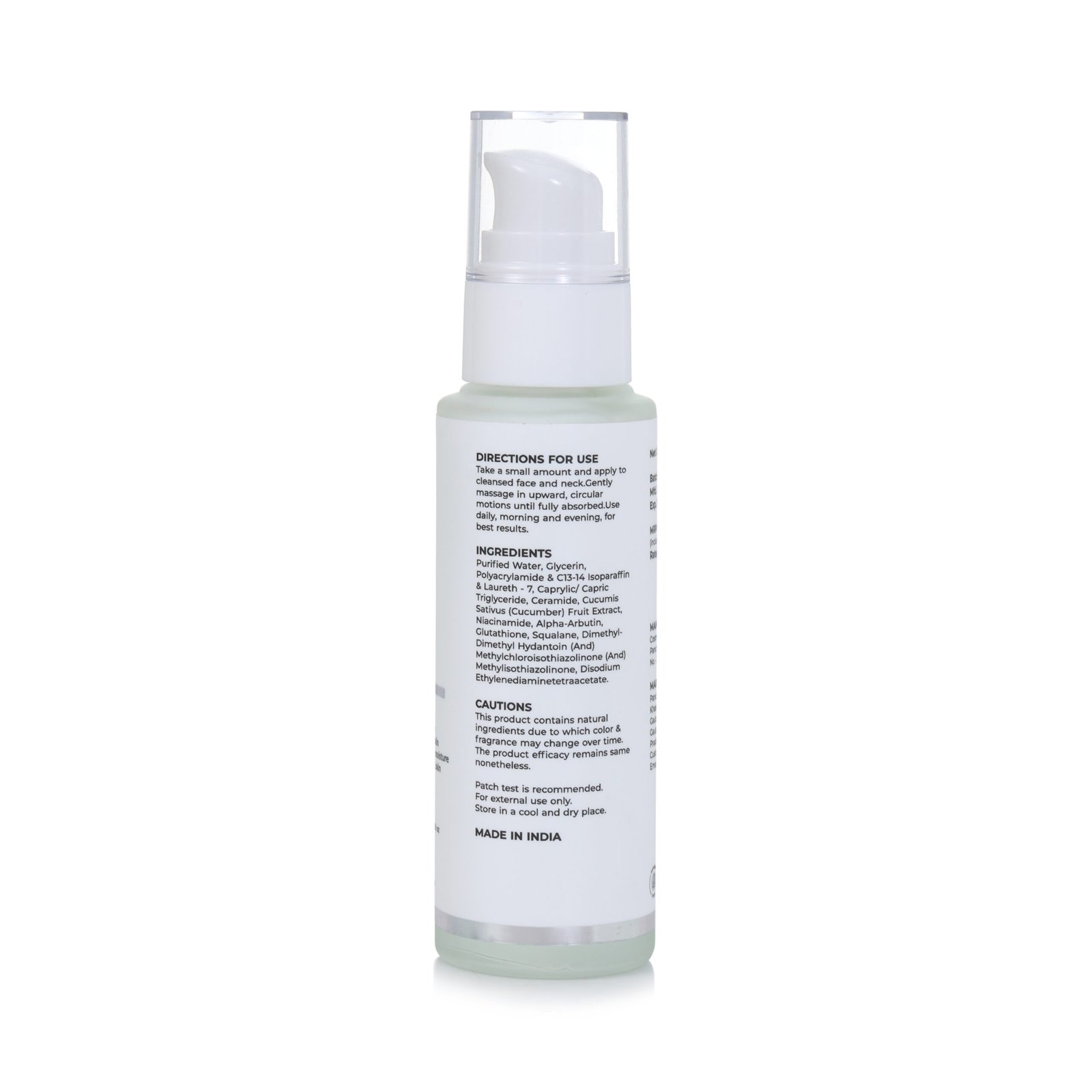 | Full Ingredient List (INCI) | Purified Water, Glycerin, Polyacrylamide & C13-14 Isoparaffin & Laureth-7, Caprylic/Capric Triglyceride, Ceramide, Cucumis Sativus (Cucumber) Fruit Extract, Niacinamide, Alpha Arbutin, Glutathione, Squalane, Dimethylol Dimethyl Hydantoin (and) Methylchloroisothiazolinone (and) Methylisothiazolinone, Disodium EDTA. |